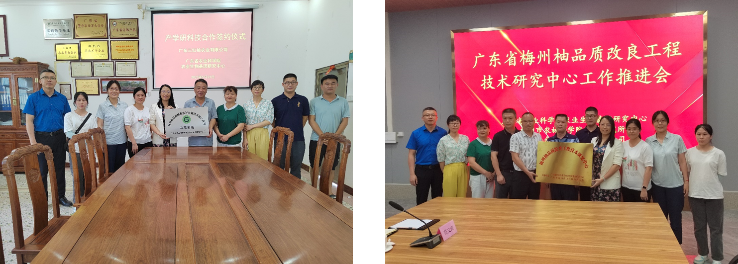此外,调研团队还深入生产一线进行实地考察,先后走访了大埔蜜柚省级现代农业产业园、梅州万川千红农业发展有限公司、大埔县通美实业有限公司等相关企业,在院企合作、科研成果转化等方面达成合作意向。其中,基因中心与广东三红柚农业有限公司、梅州万川千红农业发展有限公司两家企业签署产学研框架合作协议,联合共建“梅州柚品质精准鉴评关键技术应用推广”示范基地,为进一步推动科研成果转化和企业高质量发展提供创新动能。