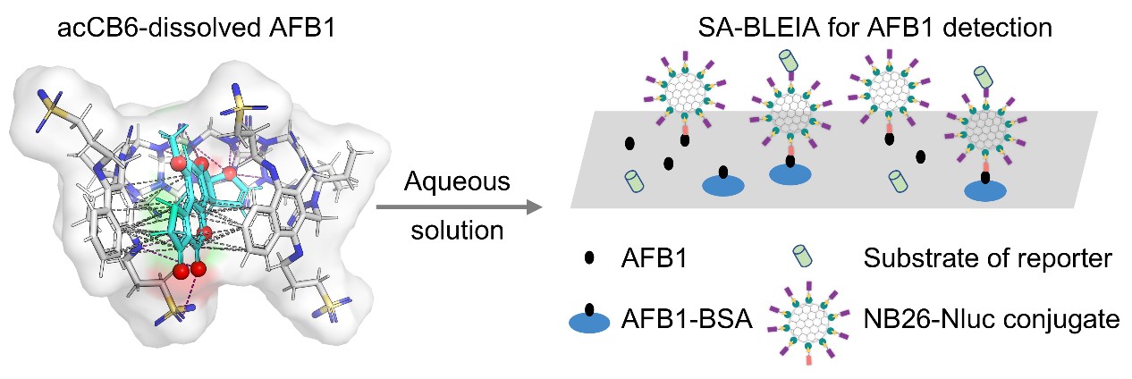 本研究创新性地研发了一种超分子化合物开环葫芦脲acCB,利用其主客体分子识别特性,开发了一种水相环境下的AFB1超分子检测平台。通过筛选系列acCB衍生物,发现acCB6可与AFB1形成稳定的1:1复合物,结合常数高达3.02×10⁶ M⁻¹,并显著提升AFB1在水中的溶解度。核磁共振、等温滴定量热及分子动力学模拟揭示了主客体间π-π堆积和静电相互作用的协同效应,为高灵敏检测奠定了基础。进一步将acCB6-AFB1体系与团队前期研发的基于支架蛋白组装的生物发光酶联免疫分析(SA-BLEIA)技术结合,成功构建了不使用有机溶剂的绿色检测平台。研究成果为农产品中黄曲霉毒素的高效监测提供了环保新方案,也为其他环境污染物的超分子识别技术开发提供了理论参考,对保障食品安全和推动可持续分析化学发展具有重要意义。