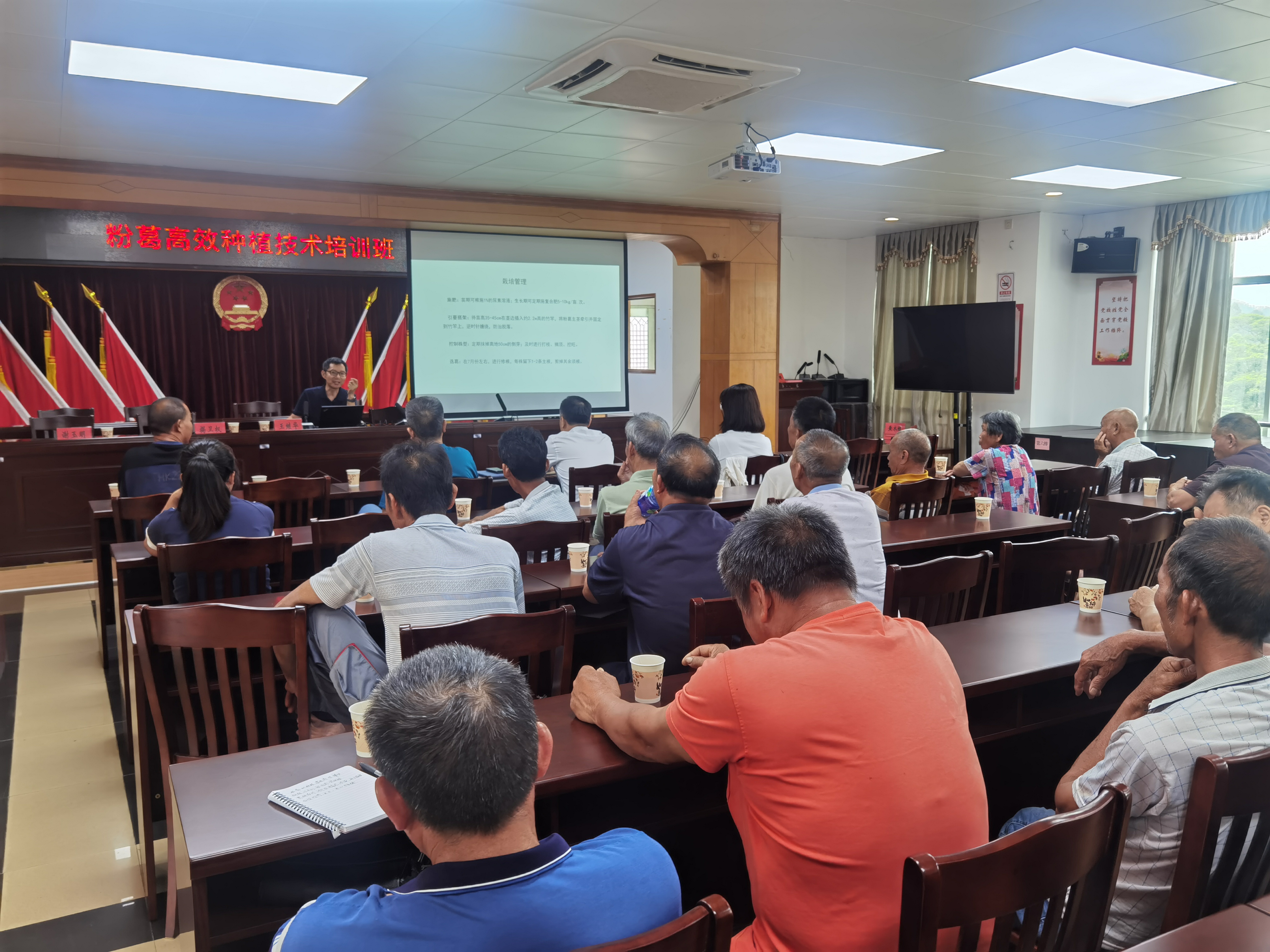 为科技助力“百千万工程”深入实施,推动新兴县水台镇粉葛产业升级,近日,我所农村科技特派员谢玉明研究员、杨鑫助理研究员和作物所王继华研究员等专家一行组成特派员团队到水台镇开展“广东省粉葛产业现状及高效种植技术培训班”。驻水台镇帮镇扶村工作队、镇农技推广人员、种植大户等经营主体人员共40余人参加培训。