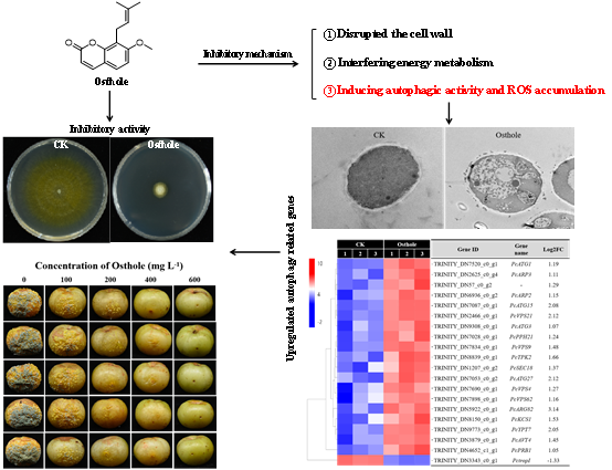 油甘,又称余甘子(Phyllanthus emblica L.)是我国南方特色的药食两用型热带水果之一,其果实采后贮运和销售过程中极易受到青霉菌等病原菌侵染,导致果实腐烂变质,给产业带来严重经济损失。本研究筛选出一种对油甘青霉菌(P. choerospondiatis)具有良好抑菌活性的生物药剂蛇床子素,首次报道了蛇床子素可以诱导真菌细胞发生自噬现象。通过转录组、电镜分析等技术,揭示了蛇床子素通过上调青霉菌自噬相关基因(PcATG1、PcATG3、PcATG15等)表达,激活自噬途径,诱导细胞内活性氧ROS积累,以及破坏细胞壁结构,从而起到抑菌作用。