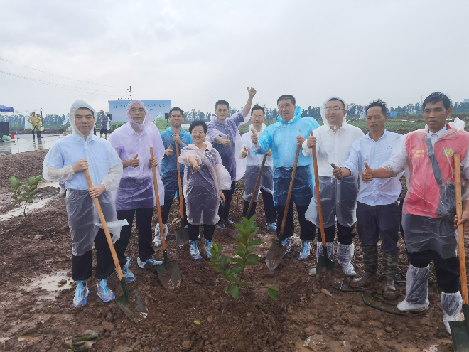活动现场,万顷沙镇党委书记高飞和果树所党委书记钟小雄一起为万顷沙番石榴博士工作站挂牌,与会代表冒雨到田间培土种植番石榴果苗。近年来,万顷沙镇坚持“立足土、体现特、做大产”,以实施‘百千万工程’为契机,将番石榴产业作为突破口,努力做好“土特产”文章。此次共建万顷沙番石榴博士工作站,将在科研成果转化、关键技术攻关和农业科技培训上进行深度合作,为培育番石榴产业高质量发展的新质生产力提供科技和人才支撑。