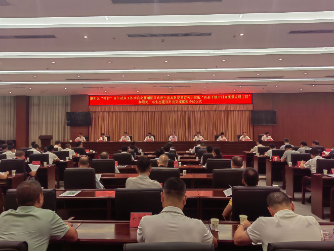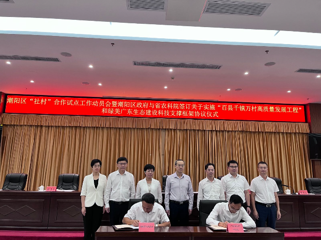 为进一步推进实施“百千万工程”、助力潮阳特色产业高质量发展,11月1日,汕头市潮阳区召开“社村”合作试点工作动员会暨潮阳区政府与省农科院签订关于实施“百县千镇万村高质量发展工程”和绿美广东生态建设科技支撑框架协议仪式,省供销社党组成员、理事会副主任林少俊,潮阳区委书记尤朝东,区领导阮韧、宋芝、郑楚泽,区直有关单位和乡镇负责人,院科技合作部副主任于深浩,果树所党委书记钟小雄、副所长董涛和有关科技人员等参加活动,会议由区委副书记李友宣主持。