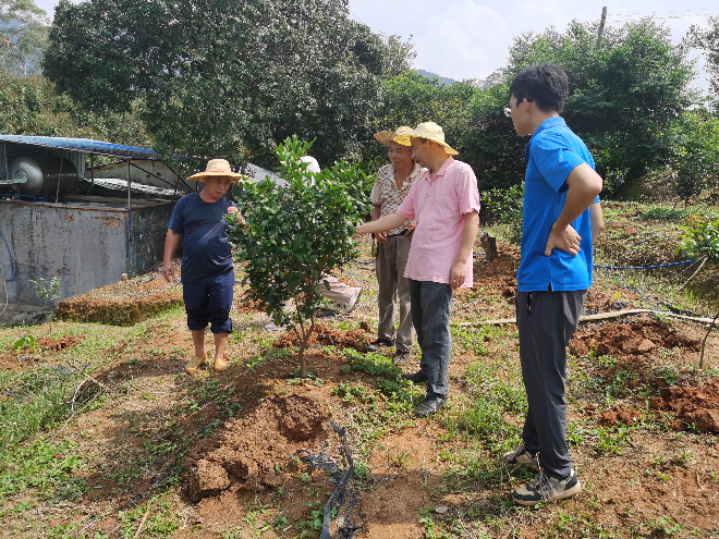 本次主要服务对象为广州优优果农业专业合作社,该公司种植柑橘面积200余亩,为红壤荒坡地,品种有砂糖橘、沃柑等。经现场考察,由于前期雨水过多、用肥不到位,前期补种的柑橘无病容器大苗长势一般、营养缺乏、新梢量不足,可能影响来年丰产。对此,团队为其提出了相应技术措施,一是根据树势与树龄,及时补充相应的肥水量,幼树施用氮素含量高的复合肥,结果树结合株产平衡用肥,同时注意中微量元素的补充,尽快恢复树势;二是对于结果数过多的树,需进行疏果,叶果比一般保持30左右;三是夏季橘园应注重柑橘木虱、溃疡病等重要病虫害的防治。团队还为对方提供了具体的肥料、农药种类与用量,以及重要病虫害的防控技术要点等建议。