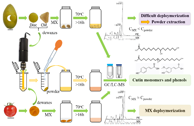 现有研究通过有机溶剂从多种植物器官表面或分离的角质膜中提取可溶性蜡质。针对角质单体的分析,通常采用NaOH-甲醇、强酸或BF3-甲醇直接解聚角质膜后再进行提取分析。尽管这些方法能有效分解部分植物的角质聚酯膜,但大部分的植物角质聚酯仍难以成功分离或角质基质无法完全直接在裂解液中解聚。因此,探索具有针对难以解聚角质聚酯的高效且广泛适用性的提取分析方法,对解析更多植物组织表面角质层代谢组成具有重要意义。