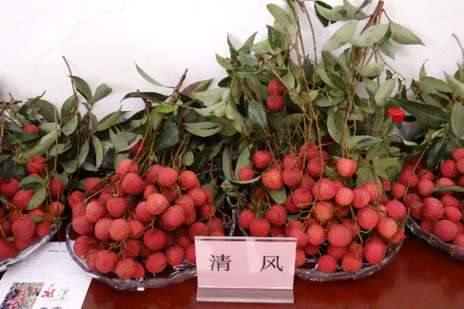 活动现场,‘清风’荔枝,果实心形,果皮颜色艳丽,比‘桂味’早10天以上成熟,且品质更优,焦核率99%以上,解决了桂味种子大小核不稳定的问题,成为新品种中最耀眼的“明星”,受到企业和媒体的广泛关注。现场还展示了100多份育种材料,给展示活动增添了独特魅力,包括经科研深度鉴评确定的高抗荔枝霜疫霉菌种质、易感病种质、高氨基酸含量种质、高糖种质、高酸种质、丰产种质、耐贮运种质等,精彩演绎了现代生物育种新路径。果皮深紫色的‘紫荔’,成熟果皮黄色的‘黄皮荔’,特大果型的‘紫娘喜’‘鹅蛋荔’,极小果型的‘野生荔枝10号’,聚无核、焦核和大核果于一株的‘禾虾串’,呈现了荔枝的生物多样性。