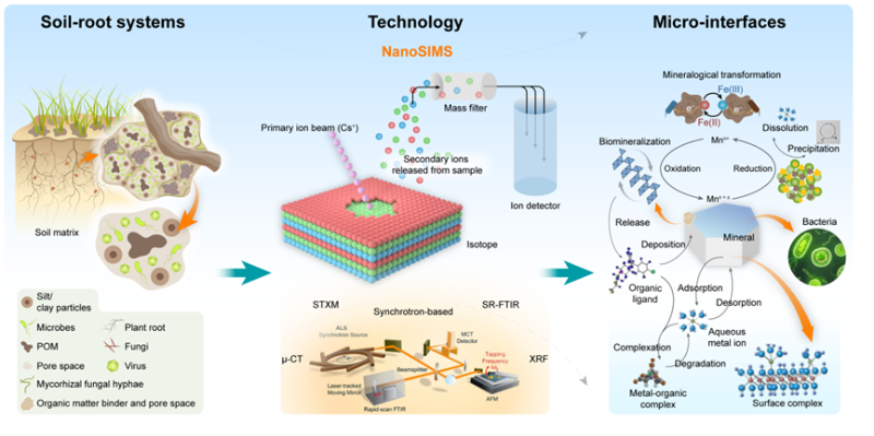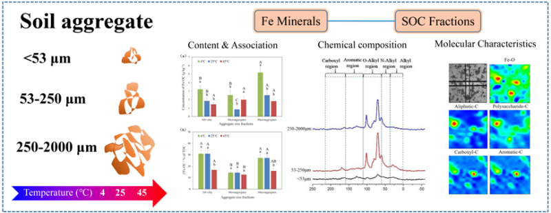 土壤有机碳库是陆地生态系统中最大的碳库,其微小波动将可能对大气二氧化碳浓度甚至全球碳平衡产生重大影响。铁矿物结合态有机碳是土壤有机碳库的重要组成部分,在土壤有机碳积累和固存中起着极其重要的作用。农田重金属污染防治技术研发团队最近系统总结了近年来纳米二次离子质谱技术(Nano-scale secondary ion mass spectrometry,NanoSIMS)在土壤碳循环、土壤-根系互作、土壤微界面重金属化学行为等领域的研究成果,强调了NanoSIMS在揭示土壤铁矿物与有机碳互作机制方面的应用潜力。此外,团队还综合应用核磁共振和傅立叶变换红外光谱技术,研究发现随着温度升高,粒径为250-2000μm的土壤团聚体中铁矿物结合态有机碳的含量下降,而粒径为53-250μm的土壤团聚体中铁矿物结合态有机碳的含量呈现出先下降后上升趋势。研究成果为深入研究土壤微观界面中铁矿物与有机碳互作机制提供新线索,并对提升当前碳达峰碳中和国家战略背景下土壤铁矿物结合态有机碳库认知具有积极作用。