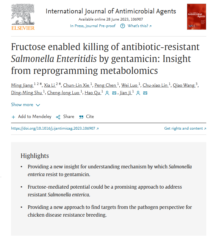 近日,动科所家禽育种与生产团队在《International Journal of Antimicrobial Agents》期刊 (Q1,IF=10.8)发表题为“Fructose enabled killing of antibiotic-resistant Salmonella Enteritidisby gentamicin: Insight from reprogramming metabolomics”的最新研究成果,好色TV 动物科学研究所为文章的第一单位,计坚和瞿浩研究员为论文通讯作者,蒋明博士为论文第一作者。