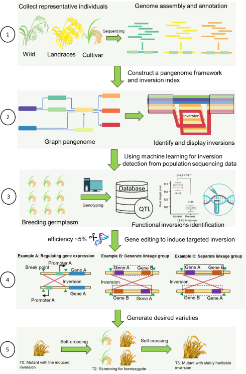 以泛基因组和机器学习方法为技术框架,利用基因编辑技术和发现倒位变异进行育种改良的流程概述