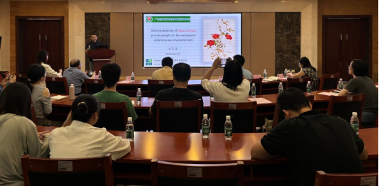 会上,马男教授作《月季乙烯敏感性的受体调节机制》报告,生动讲述了月季的起源与发展,深入、系统讲解了月季乙烯敏感性的受体调节机制。武志强研究员的《中国古老月季赤龙含珠基因组及性状解析》报告,从基因组的组装、注释和变异,月季的进化,花瓣形成的分子机制等方面进行了详细的阐述。胡丹研究员的报告以《真菌萜类天然产物的生物合成研究》为题,细致阐述了安麻吩金类抗生素等真菌萜类天然产物的生物合成途径与机制。参会人员积极提问并与报告人开展了热烈的交流和讨论。