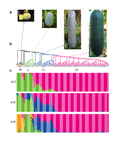 瓜类作物的果实都经历了由小变大的过程,但冬瓜的驯化历史尚不清楚,其果实长度可达1米,单果重达60公斤,巨型果实的分子机制也有待解析。在冬瓜基因组精细图谱的基础上,本研究分析了146份冬瓜资源,构建了一张包括1600万个单核苷酸多态性位点(SNPs)的全基因组遗传变异图谱,发现冬瓜也起源于印度,果实变大经历了野生种-地方种-栽培种的两步进化过程,有上千个基因发现了变化,其中两个控制冬瓜果实大小的候选基因还在黄瓜、西红柿等果实发育过程中起重要作用。
