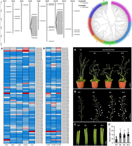 为了更系统地研究SAUR基因家族对冬瓜果实发育的调控作用,团队进行了冬瓜SAUR家族的全基因组鉴定。在冬瓜中,共鉴定出68个SAUR(BhSAUR)基因,并进行了BhSAURs的共线性、系统进化、基因结构、保守基序、顺式作用元件和表达模式分析。其中BhSAUR60(Bhi10G001538)基因在果实中特异性高表达,在拟南芥中过表达该基因导致角果变长。本研究系统分析了冬瓜SAUR基因家族,并为解析BhSAUR60基因调控冬瓜果长的分子机制提供了理论依据。