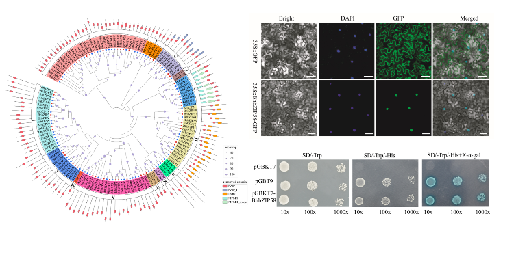 该研究鉴定了冬瓜全基因组范围的bZIP转录因子,并系统地开展了生物信息学了分析;筛选到一个响应高温胁迫的BhbZIP58基因,该基因在根部的表达量最高,蛋白定位在细胞核上,且具有转录自激活作用。结合转基因技术,分别在酵母和拟南芥中过表达BhbZIP58,并对其进行高温胁迫处理。结果发现过表达BhbZIP58的酵母菌株更大更密集,生长速度也更快;过表达拟南芥T3代植株的存活率更高,耐高温能力更强,且根系比野生型更长。本研究为分离响应冬瓜耐高温的关键基因和奠定了理论基础,也为冬瓜抗逆遗传改良提供了重要的基因资源。
