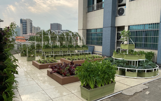 我所在4楼阳台,利用赏食兼用品种和阳台蔬菜景观栽培技术打造屋顶小菜园,美化工作环境的同时,也向外提供科普教育展示平台。