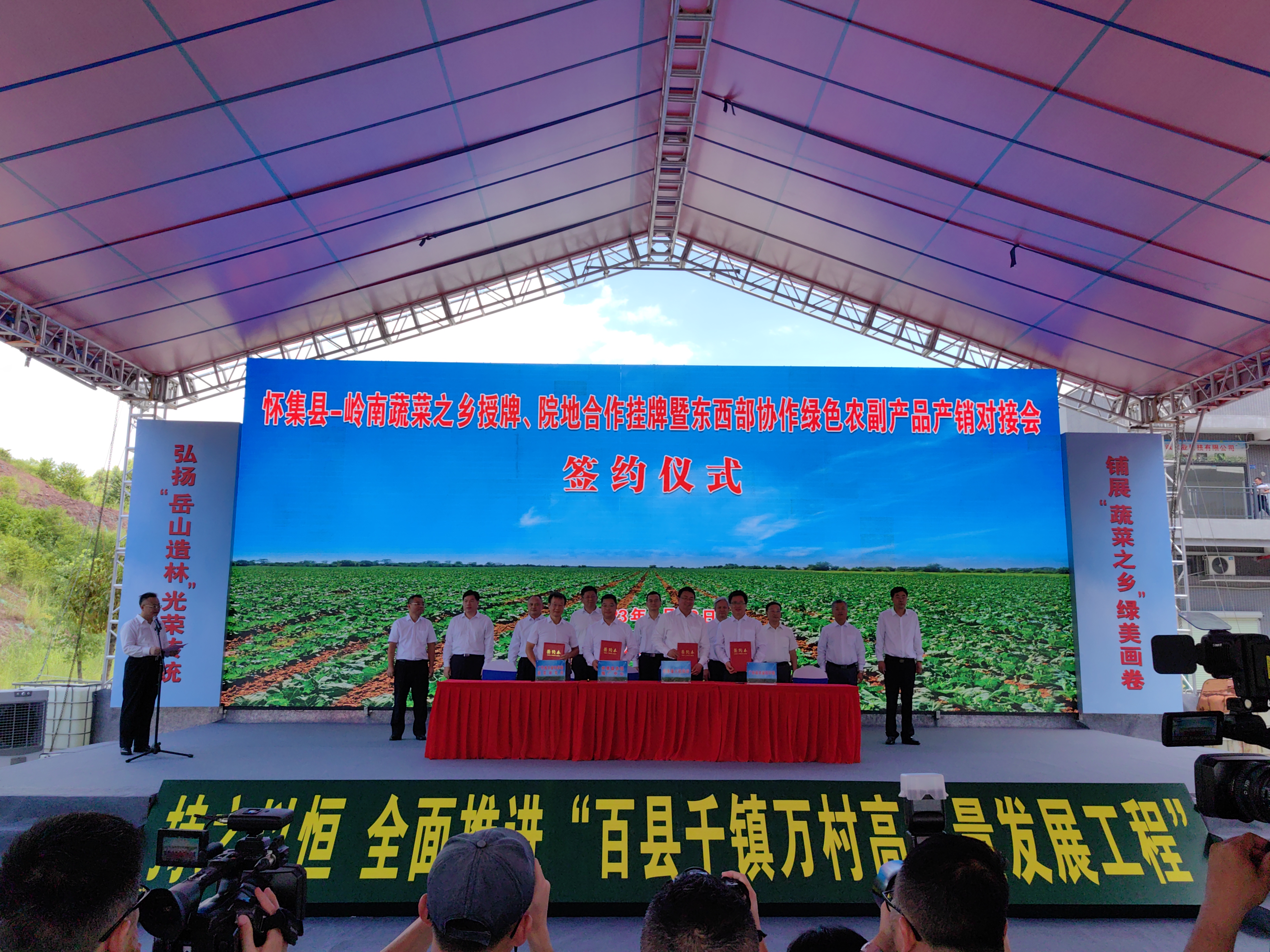 为全面贯彻落实党的二十大精神以及省委、省政府关于实施“百县千镇万村高质量发展工程”、绿美广东生态建设工作部署,7月28日,副院长何秀古率院科技合作部、我所、质标所负责同志参加怀集县-岭南蔬菜之乡授牌、院地合作挂牌及东西部协作绿色农副产品产销对接会。会上,我所所长谢大森、怀集县委副书记江建军分别代表双方签订《关于实施“百县千镇万村高质量发展工程”科技支撑框架协议》。