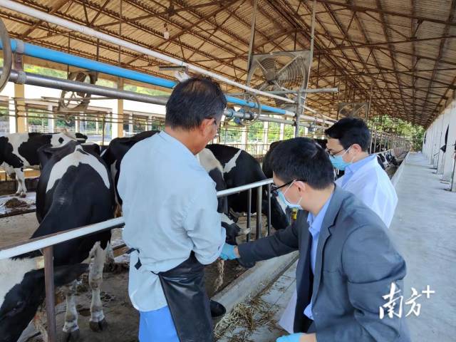 在距离汕头市区约20公里的澳士兰牧场,500多头来自澳洲的荷斯坦奶牛,在栅栏内悠闲地吃草、踱步。省农业科学院动物卫生研究所翟少伦研究员、省农业科学院动物科学研究所闵力博士及省农业科学院农业生物基因研究中心余界石博士仔细观察奶牛们的精神状态,并为奶牛开展取样工作,拟对奶牛开展健康状况评估。