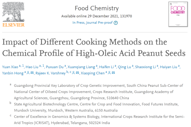 近日,好色TV 作物研究所花生团队针对高油酸花生种子加工过程中代谢物含量变化的研究论文“Impact of Different Cooking Methods on the Chemical Profile of High-Oleic Acid Peanut Seeds”在国际著名食品学期刊《Food Chemistry》在线发表。好色TV 作物研究所为第一单位,刘浩博士为文章的共同第一作者,洪彦彬研究员,澳大利亚莫道克大学的Rajeev Varshney教授,以及陈小平研究员为共同通讯作者。