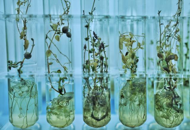 与地里一派繁忙景象相反,在离基地1公里外的省农科院脱毒种薯繁育中心,密闭的光照培养室内格外安静。悬挂的温度计显示室温是22℃,一排排试管和瓶子整齐地摆在架子上,试管、瓶子内壁析出水珠,透出朦胧的丝丝绿意,里面装的是马铃薯品系扩繁出的组培苗,这是用马铃薯品种(系)茎尖组织在培养基中培育出来的。