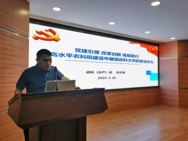 对标两会要求,根据院学习全国两会精神专题会议精神,结合高水平动科所建设工作,刘子放以《党建引领 改革创新 砥砺前行,在高水平农科院建设中展现动科大所的担当作为》为题讲党课,强调了“学、统、改、抓、创”的工作思路,并围绕动科所重点工作、重大事项,结合全面推进提升管理服务综合效能等工作进行了宣讲。