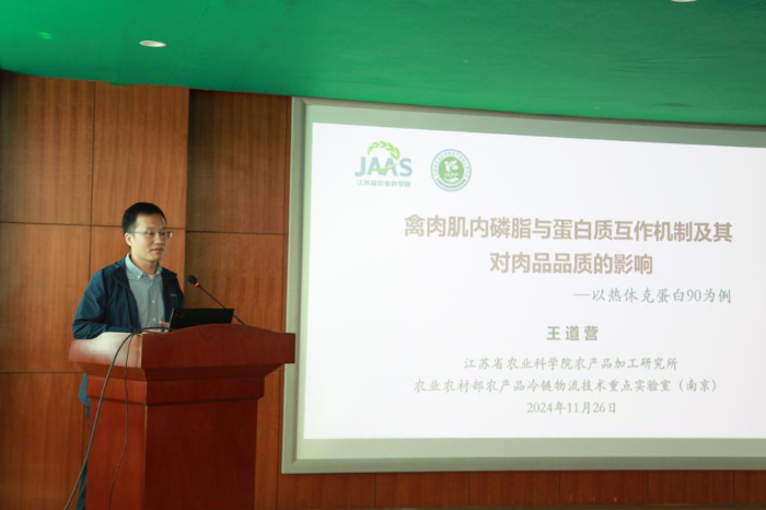 会上,王道营以热休克蛋白90(Hsp90)为例,分享了围绕禽肉肌内磷脂与蛋白质互作机制展开的一系列前沿研究。