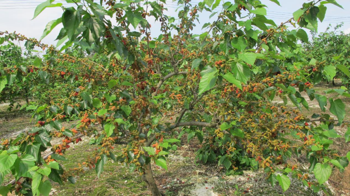 采用嫁接方法繁殖。每亩种植150~300株,树形养成二级主干,第一级主干高50~60 cm,第二级主干高30~40 cm。华南地区一年修剪1~2次,在春季采果结束后,在上年一年生枝条2~3 cm处剪去,每次剪枝去弱留强。采用化学防治和物理方法相结合进行桑果菌核病的防治。桑果始熟期和末期成熟果较少,可隔天采果一次,盛熟期天天采果,采果时轻采轻放,采适熟果,不采过熟果、发霉果和生果,采下的鲜果及时加工处理,不宜挤压、堆沤、过夜。