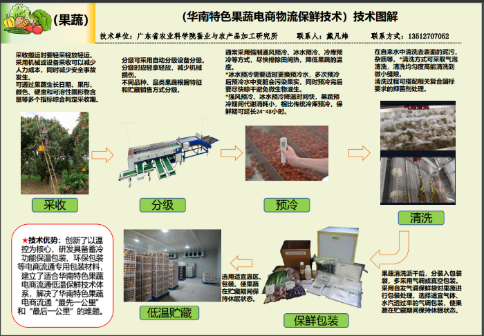 华南特色果蔬地处热带亚热带高温多湿的环境中,其采后呼吸旺盛,易滋生病菌;同时因为品类繁多,其采后生理特性各异,造成其采后保鲜困难。目前因为果蔬保鲜技术水平低,配套的全程冷链设施不完善,导致果蔬采后保鲜物流产业出现标准化、规范化和规模化不足等问题。同时,果蔬采后也面临化学防腐剂滥用等食品安全问题。华南特色果蔬电商流通中,也存在品质劣变快、损腐率高、能耗高等问题。电商是果蔬主要流通方式之一,蓄冷是目前普遍采用的冷链流通模式,但仍存在蓄冷时间短、无法控湿、成本高等问题。应用华南特色果蔬电商物流保鲜技术,提升华南特色果蔬储运保鲜技术水平,将有力推动我省果蔬保鲜物流产业的发展。