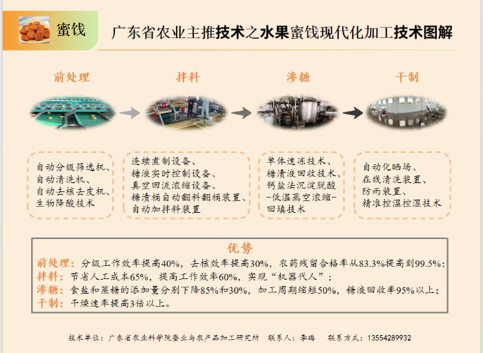 广东是蜜饯生产的第一大省,也是消费第一大省,广东占全国蜜饯市场份额的50%以上,但广式蜜饯的加工一直沿用传统工艺,生产过程机械化、自动化程度低,存在加工时间长、营养成分流失严重,水耗能耗高及质量安全问题突出等产业关键技术瓶颈问题,从而导致产业经济效益凸显困难、产品国际竞争力不强,市场上尚未形成具有规模化集群效应的龙头产品和主导品牌。基于以上问题,研发了蜜饯加工原料的自动分级筛选机、自动清洗机、自动去核机等多功能一体化前处理成套技术和设备、鲜果速冻及糖液回收技术、糖液有机酸和花色苷回填技术、柑橘皮贮藏陈化技术及蜜饯煮制拌料翻料及包装成套技术装备。