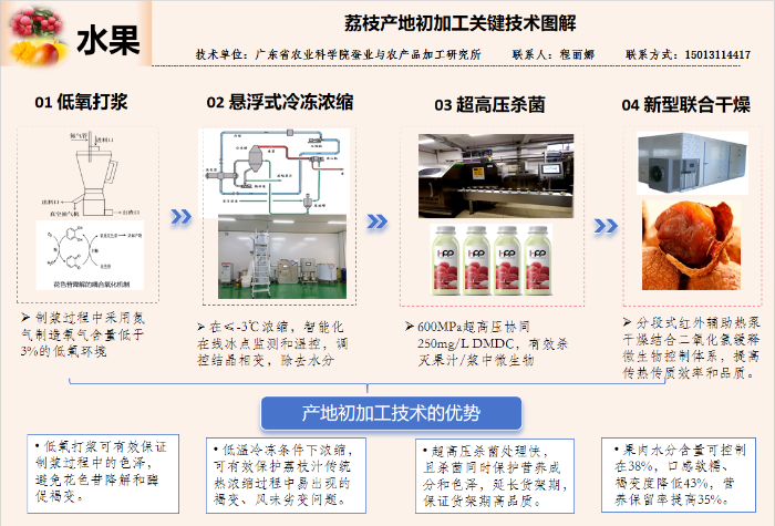 荔枝营养丰富,风味独特,但采收季节集中,且高温高湿,导致易褐变腐烂,极大降低了荔枝产业价值,也容易造成环境污染。采用荔枝产地初加工技术,可在荔枝采收后的第一时间内最大程度提高其附加值,初加工产品成品或精深加工的半成品。制汁/浆加工处理,能大批量处理原料,减少采后损失,不仅获得NFC果汁产品,同时原汁/浆是果糕、糖果、焙烤食品、西式糕点和冰淇淋果汁奶茶等食品的主要生产原料;低温浓缩加工处理,促进原汁/浆的有效流通,减少流通和贮存成本;物理场非热杀菌,可以避免传统热杀导致的色泽褐变、风味劣变等问题;节能高效干燥加工,解决荔枝不耐储以及传统日晒、炉火烘干等导致的品质不均等问题,采收后,进行快速干制,延长货架期,获得果干产品。