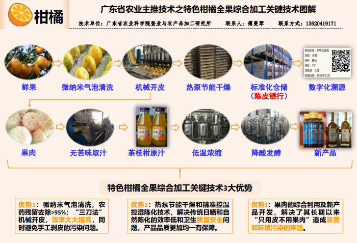 我国柑橘面积和产量均居世界第一,其中广东种植面积380万亩,产量505万吨,居全国第4,是陈皮等特色柑橘加工和销售的主要地区。长期以来由于对特色柑橘全果营养健康功效挖掘不足,加工存在“只用皮不用果肉”或“只用果肉不用皮”现象,导致全果利用不充分、产业综合效益一直不高。针对特色柑橘全果营养健康功效的物质基础不清楚、作用机制不明确、全果自动化加工技术缺乏、高附加值产品少等突出问题,围绕其主要活性物质的营养健康效应及作用机制确证,加工专用装备研制,加工及品质控制技术创建,新产品研发等开展创新性系统研究。