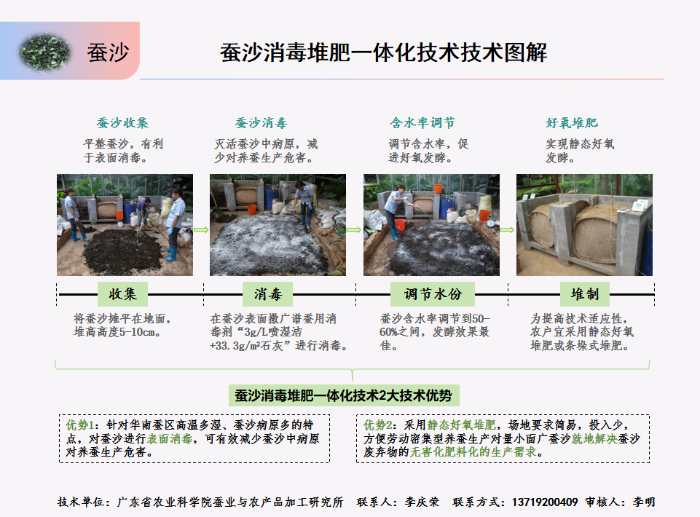 华南蚕区气候条件高温多湿,一年中10个月可以连续养蚕,由于蚕造密,批次交叉,养蚕前后的清洁消毒难以彻底;另外,与蚕室蚕具消毒和蚕体蚕座消毒防病相比,对蚕沙的处理并未得到足够的重视,蚕沙随意丢弃现象严重,对环境和生产的危害更突出,已成为华南蚕区传染性蚕病防治的薄弱环节。本技术针对这一问题,开展了蚕沙无害化肥料化利用研究,建立了蚕沙消毒堆肥一体化处理技术,并在两广蚕区进行了推广,先后建立了多个示范基地(化州笪桥基地、阳山小江基地、阳山高峰基地),开展蚕沙就地消毒和集中收集堆肥处理示范试验,起到了良好的示范辐射效果。该技术的实施对于减少蚕区病原污染、净化蚕区环境、帮忙蚕农增产增收起到积极的促进作用,对推动蚕业生产良性发展具有重要的意义。