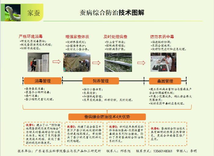 近年来,家蚕病毒病和农药微量中毒频发,对蚕桑生产造成严重威胁,直接影响着蚕茧产量、质量与蚕农的收益。华南蚕区地处亚热带,长年高温多湿,养蚕批次交叉重叠,蚕病发生更加严重,每年因蚕病发生造成的损失高达20%以上。本技术通过系统研究我省养蚕过程中主要蚕病的发生规律,建立了具有华南特色的蚕病综合防治技术体系,显著降低了蚕病发生率,稳定了蚕桑生产安全。