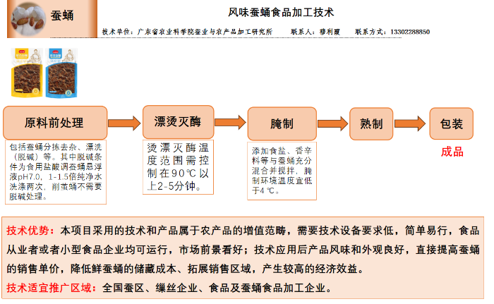针对蚕蛹生产受季节限制和保藏困难的问题,通过原料的筛选、烫漂灭酶、(脱碱)、腌制、熟制、包装、灭菌等工艺,生产直接或经过简单加热后食用的蚕蛹,该技术对于全面提升蚕蛹资源的附加产值和拓展受众群体、降低储藏成本等具有重要意义。有利于缓解蚕蛹生产的季节性和保质期,增加农民收入和提高企业效益。