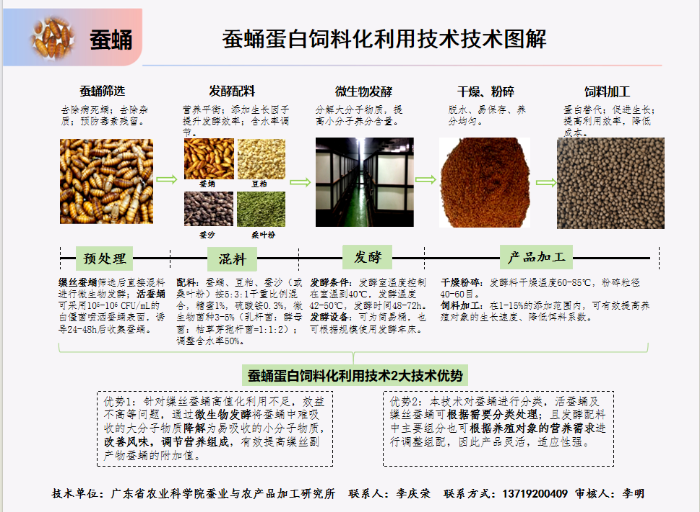 蚕蛹是传统种桑养蚕的大宗副产物,我省鲜蚕蛹年产量约5000吨左右。蚕蛹不仅是优质蛋白原料来源,还富含黄酮、抗菌肽、诱食肽等功能性活性物质,非常适合作为饲料用蛋白;但蚕蛹所含4%—6%甲壳素不易消化,蚕蛹脂肪含量高,极易氧化变质产生异味,影响饲料的适口性和鱼虾等水产品的风味。因此本技术针对蚕蛹资源利用率低,附加值不高、饲料化利用关键技术缺乏等问题,通过选育优良菌种及组配,应用微生物诱导与发酵技术、利用固态发酵对这些蛋白进行脱毒除臭、降解等处理,把结构复杂的蛋白质降解为动物容易吸收利用的功能丰富的多肽产品,为饲料工业和养殖业提供优质的蛋白原料。技术的实施与推广,一方面解决缫丝产业副产物蚕蛹的资源利用效率问题,另一方面也可用于水产饲料、畜禽饲料中的鱼粉等替代及诱食等功能饲料的开发。