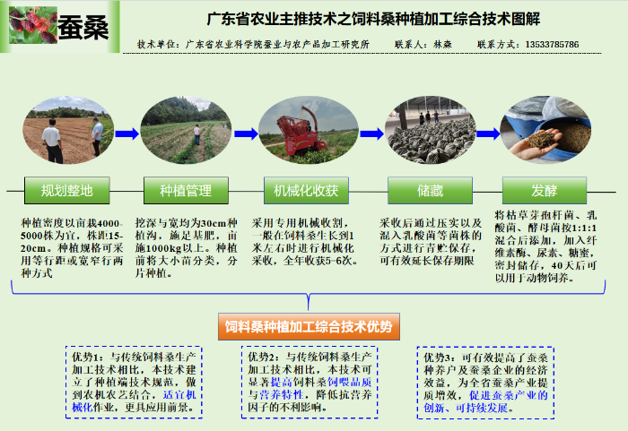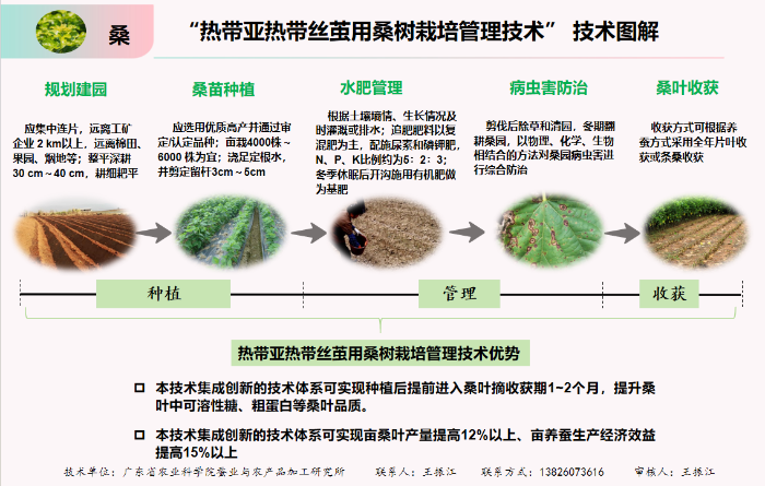 华南地区是我国主要的蚕桑生产区域之一,由于我省地处华南地区,独特的热带亚热带气候决定了蚕桑生产模式区别于全国传统模式,我省养蚕用桑树种植主要是用种子繁殖,桑园管理较为粗放,蚕桑生产为省力化模式,为适应这一特点我省先后选育出了桑树主栽品种粤桑11号、粤桑51号等。这些桑树品种的大面积推广应用需要相配套的种植管理技术支撑。本技术结合我省蚕桑生产实际,确定了蚕桑生产用桑树品种种植栽培技术参数,包括种植密度、树形养成、修剪方法、肥料管理、水分管理、杂草管理、病虫害防治和收获运输等。