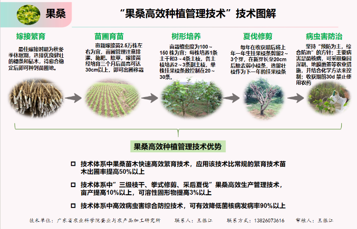 长期以来,桑树主要用于养蚕生产蚕茧,以桑叶高产优质为种植管理目标,桑果只是蚕桑生产上的副产物,没有被作为一种水果品种进行种植管理。进入二十一世纪以来,桑果作为一种新型水果品种受到广大消费者及市场青睐,我省果桑种植面积迅速扩大,已成为蚕桑产业发展的新亮点。由于果桑生产目的和生长特性不同于传统蚕桑生产用品种,其种苗繁育及配套种植管理技术亟待建立。本技术建立了一套适用于华南地区果桑种植管理技术,包含果桑种苗繁育技术、果桑规划建园技术、果桑种植技术、果桑管理技术、病虫害防治技术、桑果产量及品质管理技术等。本技术可满足桑果产业化发展的需求,促进我省桑果产业的快速发展。