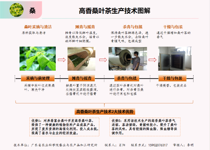 该技术利用丰富的桑叶资源,通过原料的分级和整理、鲜叶摊香、桑叶做青、高温杀青、揉捻做型和干燥提香等工艺,生产高香桑叶乌龙茶。针对桑叶味腥性寒等问题,对桑叶进行了多级发酵提香工艺处理,摆脱了传统桑叶茶的青草味,使得桑叶茶风味得到很大程度的提升,更适应消费者感官需求,并能有效避免了桑叶本身寒凉的特质,特别适合糖尿病、高血压患者长期饮用。不仅拓展延伸了桑叶的消费领域,为市场提供了一种受欢迎的健康植物饮料产品,而且极大地促进了桑农经济效益的提高,为传统蚕桑业增铺了一条致富之路。