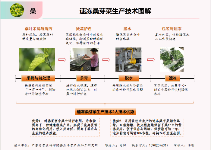 通过原料的分级和筛选、清洗、烫漂、脱水、包装、冷冻等工艺,生产系列速冻桑芽菜产品。该技术对桑芽进行灭酶后速冻处理,能使产品在保证颜色鲜绿的基础上,营养成分和活性成分得到最大保留,解决了桑叶不耐储藏、色泽不美观、活性成分损失过大的问题。该技术不仅拓展桑叶的利用领域,为市场提供了一种健康蔬菜产品,而且极大地促进了蚕农养蚕经济效益的提高。