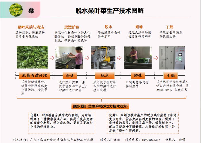 桑叶具有促进新陈代谢、增强机体免疫功能、调节血糖血脂代谢等功效,随着桑叶在农业生产以外的营养健康价值逐步为大众所认知,利用现代食品加工技术研发桑叶健康产品开始成为社会健康产业的迫切需求。本技术通过对近20个桑树品种的桑叶进行加工筛选,综合评分筛选出粤桑11号、抗青10号、大10等适宜作为生产脱水桑叶菜的桑树品种。采用桑树绿色生产基地桑叶,通过原料的分级和筛选、清洗、烫漂、脱水和干燥等工艺,生产系列脱水桑叶菜产品。该技术针对鲜桑叶不耐储藏、长途运输易发热导致的“烧叶”等问题,对养蚕富余的桑叶进行了脱水干燥加工,不仅拓展桑叶的利用领域,为市场提供了一种健康蔬菜产品,而且实现了废弃资源的高值化利用,极大地促进了蚕农养蚕经济效益的提高。