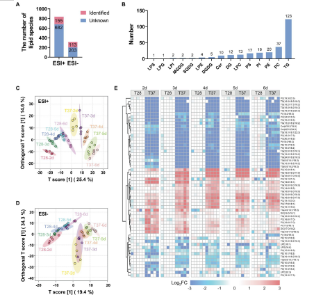 该研究团队综合运用了代谢组学、脂质组学和分子生物学技术手段,从胞内全局代谢变化层面探究温度如何调控黄曲霉菌中黄曲霉毒素的合成。研究结果表明,在黄曲霉菌生长早期,不产毒素的高温(37℃)下,黄曲霉菌胞内氨基酸和碳水化合物代谢得到显著促进,这与观察到的早期更为快速的菌丝生长表型相一致。进一步分析发现,在利于产毒素的低温(28℃)下,黄曲霉菌胞内大多数脂质的侧链和游离脂肪酸的不饱和度更高,并且脂类物质的不饱和度与黄曲霉毒素的合成呈正相关。qRT-PCR实验表明,在低温下,黄曲霉菌胞内的脂肪酸去饱和酶的表达被上调,与不饱和脂肪酸的高含量相一致。该研究首次揭示黄曲霉菌响应不同环境温度的胞内脂类物质的积累特征,以及提示了多不饱和脂肪酸容易诱发胞内氧化应激促进黄曲霉毒素的合成。研究结果为进一步探索黄曲霉菌中脂质氧化、氧化应激和黄曲霉毒素合成的关系,及黄曲霉毒素的防控提供新的理论基础。