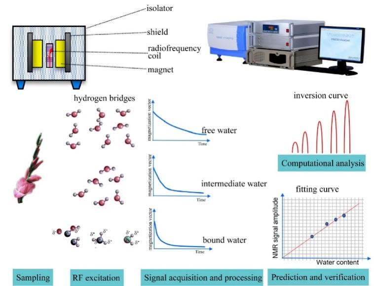 水分子具有极性,可与其他生物成分结合,成为生化反应的最好溶剂,保证了各种营养物质的转运。然而,作物采后脱离母体,水分子动态迁移“状态”及其分布缺乏系统研究。基因中心研究团队近期以四大切花之一的剑兰(gladiolus hybridus Hort)为材料,利用低场核磁共振和质子密度加权磁共振成像技术鉴定了3种不同横向弛豫时间值的水组分,经纳米银预处理后的切花束缚水和游离水在培养初期较低,但两天后各水态的信号幅值均超过对照,说明纳米银预处理增强了切花的持水能力。同时,利用x射线能谱和扫描电镜检测发现纳米银随水分沿木质部向上运输,抑制了茎腐烂并减轻细菌在茎的阻塞。此外,该研究建立了含水率预测模型,可以快速准确地预测切花的含水量,满足切花营养液生产工艺调整的实时反馈要求。