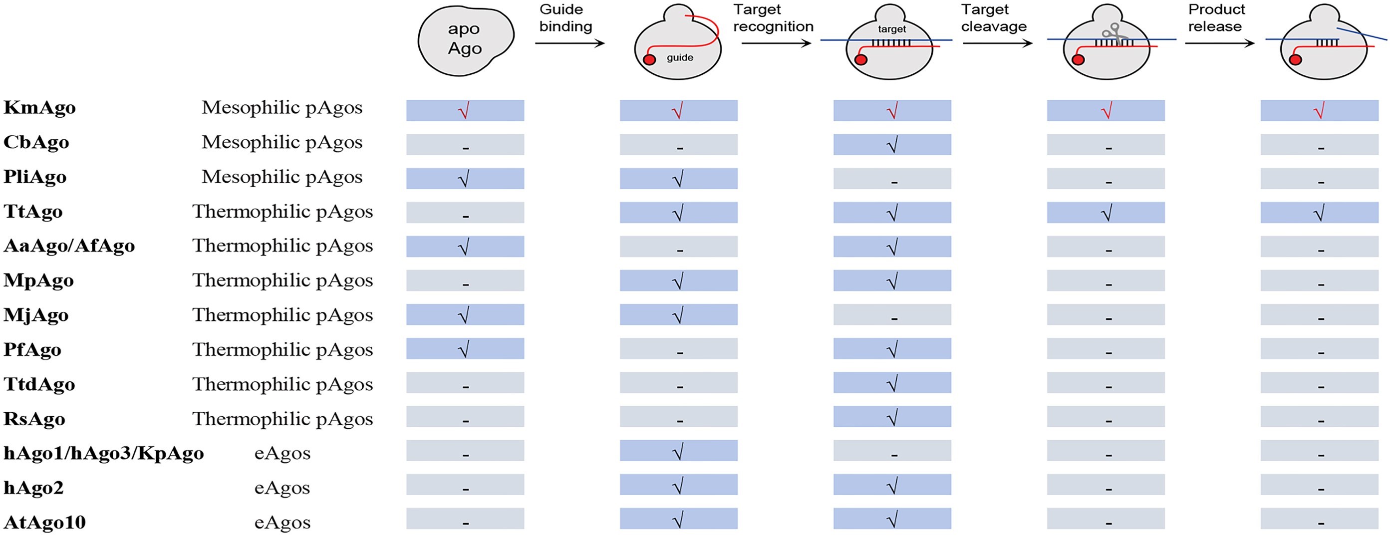 Argonaute (Ago)蛋白是核酸引导的可编程核酸酶,真核Ago (eAgo)蛋白利用短RNA作为靶向互补RNA序列介导RNA干扰,原核Ago (pAgo)蛋白利用引导DNA或引导RNA同时靶向DNA或RNA。因此,pAgos显示出更广泛的功能。eAgos和大部分长pAgos由6个主要结构域组成:N (N端)、L1 (link1)、PAZ、L2 (link2)、MID和PIWI。在大多数研究的pAgos和eAgos中,目标切割的位置通常在第10和第11个向导核苷酸之间。由于pAgos的蛋白尺寸相对较小,并且在引导结合或靶标识别过程中对特定基序的要求更低,因此pAgos特别是中温性pAgos被认为在核酸操作和基因编辑等方面具有重要潜力。