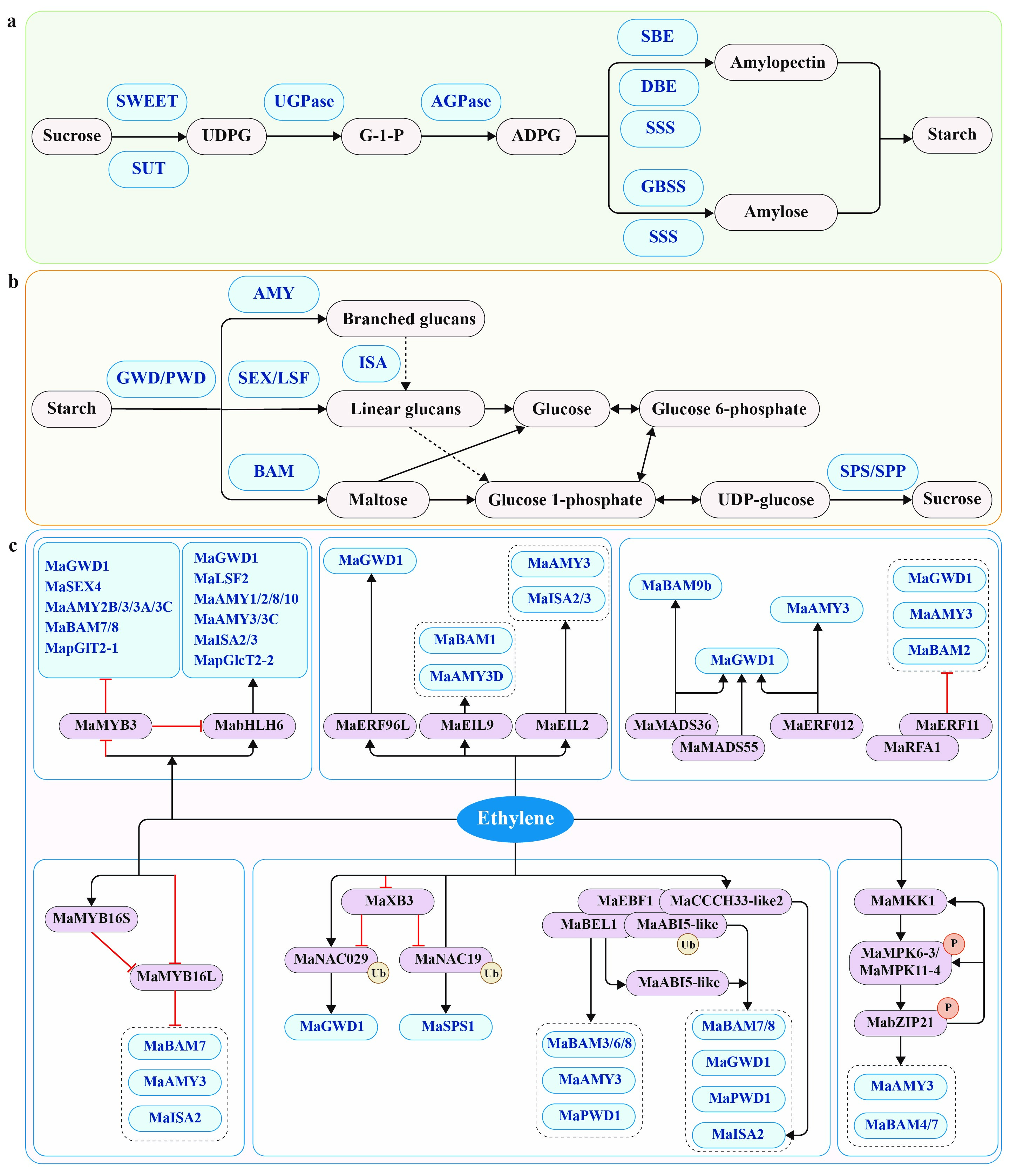 图1. 调控香蕉果实淀粉代谢的关键酶和调节因子。(a) 淀粉生物合成途径。(b) 淀粉降解途径。(c) 乙烯介导的淀粉降解调控网络。