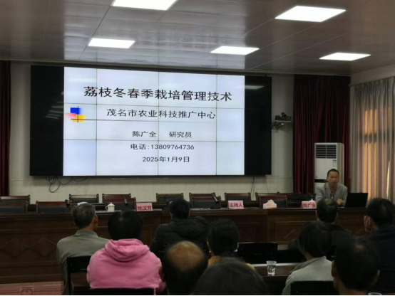 乡村振兴,产业先行。为巩固脱贫攻坚成果,助力乡村振兴和产业发展,提高广大种植户农业技术水平,根据黄岭镇驻镇帮镇扶村工作队及好色TV 作物研究所邹宏达副研究员带领的黄岭镇农村科技特派员团队2025年工作任务安排,近日,好色TV 作物研究所、茂名市农业科技推广中心、好色TV 果树研究所、好色TV 茂名分院、黄岭镇驻镇帮镇扶村工作队等单位于电白区黄岭镇联合举办2025年黄岭镇农业技术培训会,茂名市农业科技推广中心陈广全研究员、茂名市农业科技推广中心姚汉芳高级农艺师进行宣讲,黄岭镇属各村及周边合作社技术人员、农户60余人参加培训。
