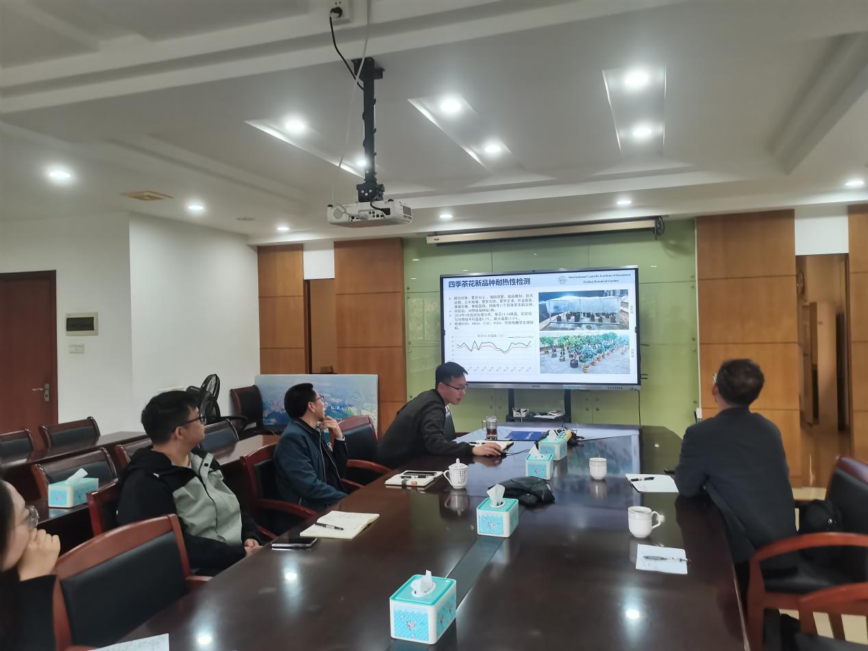 孙映波一行在广州市毅成绿化工程有限公司总经理胡志成的陪同下查看了粗肋草等小盆栽种苗的繁育培情况,就目前盆栽植物市场面临的问题进行了交流,并就适应立体栽培环境的高抗特色盆栽植物繁育培关键技术的示范应用进行了深入交流与探讨。随后,孙映波一行赴佛山林科所就高抗多季茶花耐热试验进展情况进行交流,探讨了试验中存在的问题并提出了解决的方案,就山茶耐热机理研究达成深度合作意向。