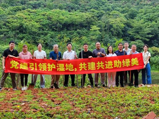 座谈会上,环艺所水环境修复研究室党支部书记秦红杰领学《习近平在中共中央政治局第二十一次集体学习的重要讲话精神》,姚汉年、蔡坚、马青分别介绍环艺所、生物多样性保护研究所和西江所的基本情况,三方在加强党建引领湿地建设与人居环境提升等方面深入交流。活动期间,与会人员先后前往省林科院西江所生态系统治理示范基地开展小微湿地现状调研与湿地植物种植,随后还前往了省林科院西江所苗圃基地参观。