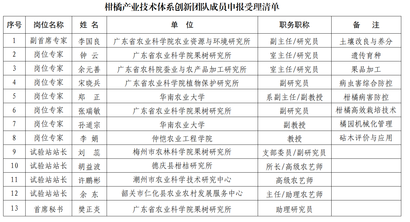 关于广东省柑橘产业技术体系团队成员申报受理情况的公示