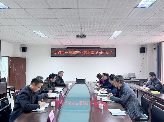 在翁源县农业技术推广办公室,双方联合开展学习贯彻广东省高质量发展大会精神主题党日活动,畅谈学习心得体会,并围绕推动翁源特色水果产业和科技互促双强等开展了讨论,一致表示翁源三华李、九仙桃等特色水果产业有规模、有特色、有效益,是重要的富民兴村产业,果树所与翁源县合作基础扎实,特别是2021年合作共建三华李九仙桃研究院以来,通过建设高标准示范基地,专家团队围绕制约产业发展关键共性技术问题做了大量工作并取得良好进展,得到果农的高度认可。希望通过“双百行动”对接服务,在早熟品种选育、避雨设施应用、科学修剪、采后商品化处理等方面进一步加强科技攻关推广,帮助产业提质增效,提高果农收入。