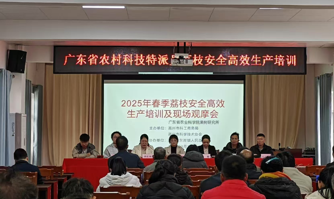为深入贯彻落实2025年中央一号文件提到的“千方百计推动农业增效益、农村增活力、农民增收入”精神,近日,果树所蒋侬辉特派员团队联合东岸镇人民政府、珠海市对口茂名市乡村振兴驻高州东岸镇帮扶工作队、国家荔枝龙眼产业技术体系茂名综合试验站、高州市科工商局、高州市科协等多家单位,在东岸镇举办2025年春季荔枝安全高效生产技术培训会,100多名荔枝果农参加培训。