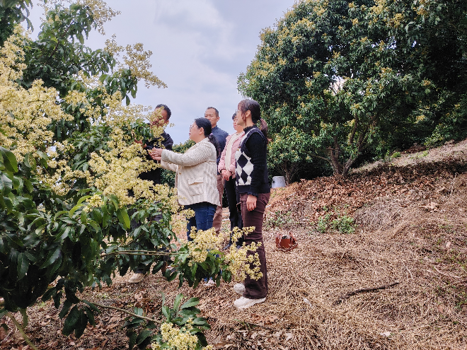 当天在驻镇帮扶工作队陪同下,蒋侬辉特派员还深入该镇谈朋村、旺垌村荔枝果园开展实地调研,针对目前荔枝花量大,提出加强疏花管理、果园多淋水降温防爆花,并对新品种改良进行了现场指导。