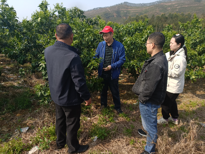 特派员专家团队前往英德市锦福盛农业有限公司,该公司种植柑橘面积600余亩,为红壤荒坡地,品种有沃柑、砂糖橘、红美人等,年产量上百万斤。经现场考察,橘园整齐、修剪到位、具丰产树冠、病虫害危害较轻。但发现由于上年结果量大、干旱时间长,树势中等、花量较大、新梢过密、叶色亚绿色、缺硼镁等营养元素较明显,品种间花期不一致,砂糖橘已为谢花期,红美人为初花期且不整齐,沃柑花待张开等情况。对此,团队提出相应技术措施,一是根据树势与当年株产,及时补充相应的肥水量,尤其注意中微量元素的补充,促花保果,尽早恢复树势与叶色;二是新梢量过大过密,尤其是红美人品种,应及时疏去外围的过密新梢;三是花期防治蓟马与病菌等应分区分品种进行,先开花的先防治。团队还为对方提供了具体的大量元素、中微量元素、农药种类及用量与使用方法等,并为后续幼果期的绿色管理及品牌建设提供了建议。