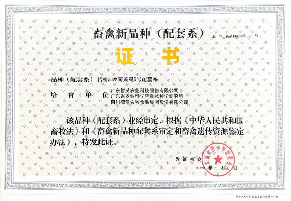 2024年3月7日,中华人民共和国农业农村部第762号公告决定颁发岭南黄鸡5号配套系新品种(配套系)证书(农09新品种证字第107号),岭南黄鸡系列配套系又添新成员。